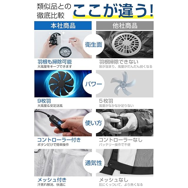 【強力送風・3段階風力調節】 空調作業服 は高性能ファン採用!9枚羽根&DCブラシレスモーター搭載で、強力かつムラの少ない風をお届けします。また、3段階風量調節でき、好みや体感によって切替できます。風量調節やファンの運転開始・停止を簡単に操作可能のコントローラー付いており、便利です 。ファンはカバー取り外せるデザインで、羽根の掃除ができいつも清潔におつかいいただけます。