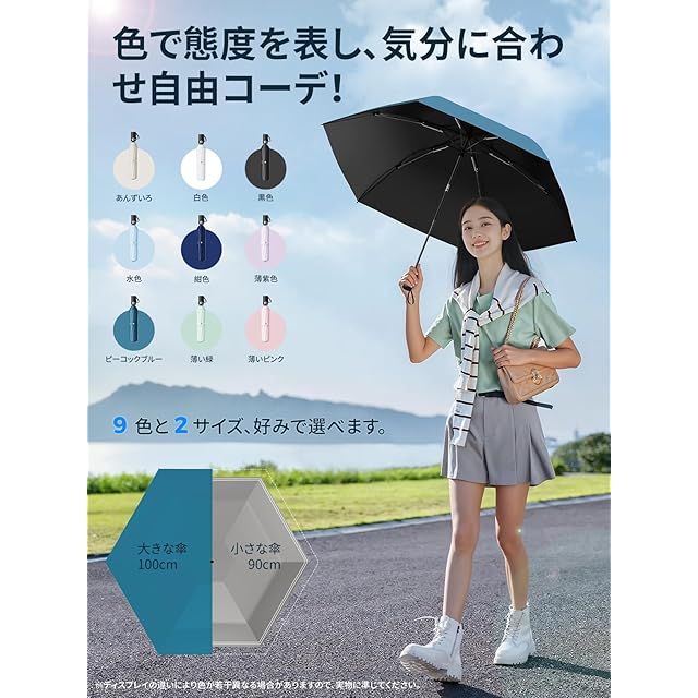 【大小2 種類のサイズ、傘下直径 90cm/100cm・9 色から選べます】90cm の小サイズは軽量で持ち運びが簡単で、いつでもどこでも風や雨を遮ってくれます。日常の通勤や買い物の際に、最適なお供となります。100cm の大サイズは、適切な遮蔽面積で、全方位の保護を提供します。突然の激しい雨でも、心配することはありません 。人それぞれユニークな個性とスタイルを持っています。UPEB が丹念にデザインした 9 色は、服との相性が良いだけでなく、それぞれ鮮明で特徴的です。傘を差して歩くすべての瞬間に、あなたが独一無二の風景になれます 。