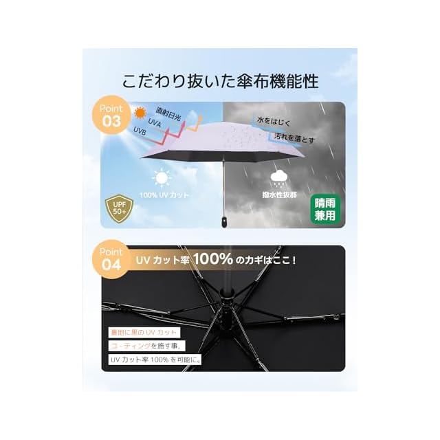 【晴雨兼用*耐風撥水】310T高密度の撥水加工材料で作られ、雨が珠のように丸くなり転がり落ちます。普通の傘より撥水性が優れ、軽く振るだけで雨水を振り払えます。長い間使用しても雨の染み込みが気にならなくなりました。電車内等の公共の場では人にご迷惑を掛けません。また防汚効果もあり、汚れにも強い生地です。中棒は頑丈航空機用アルミ合金製造、6本の傘骨にグラスファイバーと航空機用アルミ合金を使用しました。耐久性に優れています。強風で裏返っても元に戻ります。