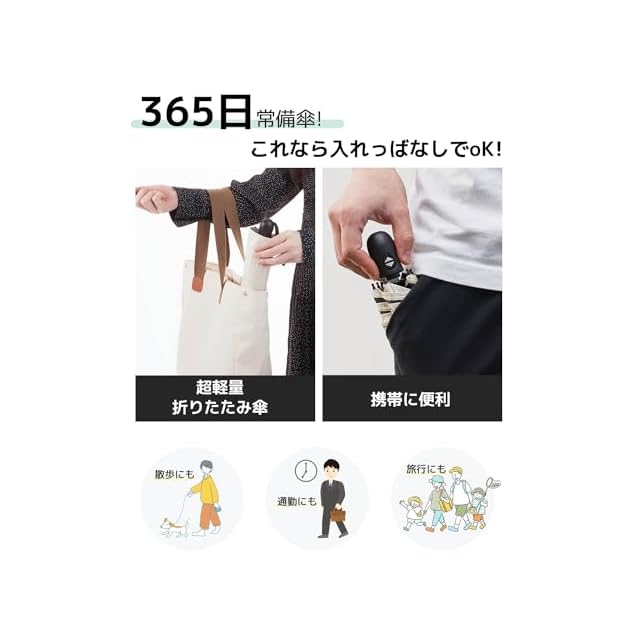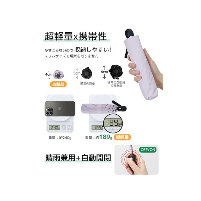 【超軽量*携帯便利*省力60%】改良版は60%省力:私たちは力の弱いお客様向けに、傘の収納の重さを改良しました。折りたたみ日傘フラットなデザインで、バッグに簡単に入れることができます。折りたたんだ厚さはわずか4cm、長さは25.5cm、重さは約189gです。超コンパクトボディ 使用?携帯に便利!全天候対応でき、雨の日も雪の日も晴天も使えます。男女兼用ワンタッチ 自動開閉折り畳み傘。通学、通勤、遠足、旅行,出張などの場合がご利用できます。