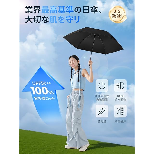 商品名:【JIS認証·現役皮膚科医監修】日傘 UVカット100遮光遮熱 折り畳み【業界初!改良型ワンタッチ自動開閉】UPEBおりたたみ傘 188g-230g超軽量 コンパクト 紫外線遮断 折りたたみ傘 耐風撥水 晴雨兼用 携帯便利 日傘メンズ/レディース/ガールズ/ガールズ/子供/大人兼用 収納ポーチ付き 母の日 父の日 お祝い 誕生日プレゼント2年品質 (ブラック, 100cm直径超大サイズ)