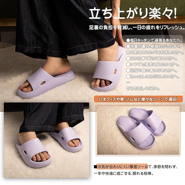 ●【抗菌防臭最新EVA素材/ 汚れに強い/丸洗い可】環境にやさしい最新EVA素材を一体成型で、何回洗濯してもこうきん機能が持続するAg+あんしんスリッパ!、解放な踵部分だから、水溜まらなく、余分な水を流しやすく、シャワー浴びてくるも問題ない。通年適用サンダルとして、室内に使用に限らず、屋外の街歩きなどにもサンダルとしての使用もメリット。
