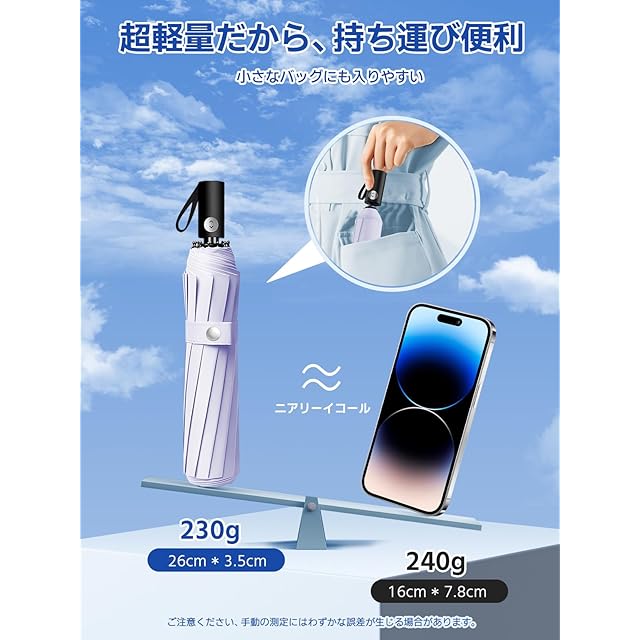 商品名:【現役皮膚科医監修 JIS認証&段階収納】日傘 UVカット100遮光遮熱 折り畳み傘【業界初!安全式自動開閉】ALwgreen折りたたみ傘 大きい超軽量 熱中症対策 肌を守る おりたたみ傘 晴雨兼用 耐風頑丈 携帯便利 超撥水日傘兼用雨傘 レディース/メンズ/子供/大人兼用 収納ポーチ付き 母の日 父の日 お祝い 誕生日プレゼント2年メーカー (薄紫)