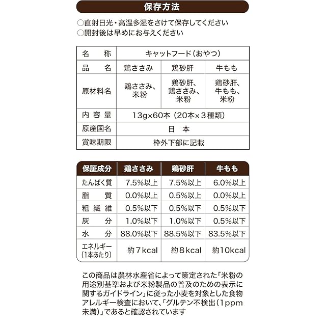 無添加ピュアシリーズ3種(鶏ささみ、鶏砂肝、牛もも)各20本ずつが1箱になったお得なパック ペロペロなめても フードにかけても 原材料&米粉のみ使用 日本産無添加ぴゅ~れおやつ ~こだわりバリューポイント~ 5つのNo ●No増粘剤●No着色料 ●Noグルテン ●No甘味料 ●No調味料 添加物不使用 余計なものを使わずピュア素材だけをギュッと凝縮。 〈原材料〉 【鶏ささみ】鶏ささみ、米粉 【鶏砂肝】鶏砂肝、鶏ささみ、米粉 【牛もも】鶏砂肝、牛もも、米粉〈成分〉 【鶏ささみ】たんぱく質:7.5%以上、脂質:0.0%以上、粗繊維:0.5%以下、灰分:1.0%以下、水分:88.0%以下、エネルギー(1本あたり)約7kcal 【鶏砂肝】たんぱく質:7.5%以上、脂質:0.5%以上、粗繊維:0.5%以下、灰分:1.0%以下、水分:88.5%以下、エネルギー(1本あたり)約8kcal 【牛もも】たんぱく質:6.0%以上、脂質:0.0%以上、粗繊維:0.5%以下、灰分:0.5%以下、水分:83.5%以下、エネルギー(1本あたり)約10kcal〈内容量(1本あたり)〉13g