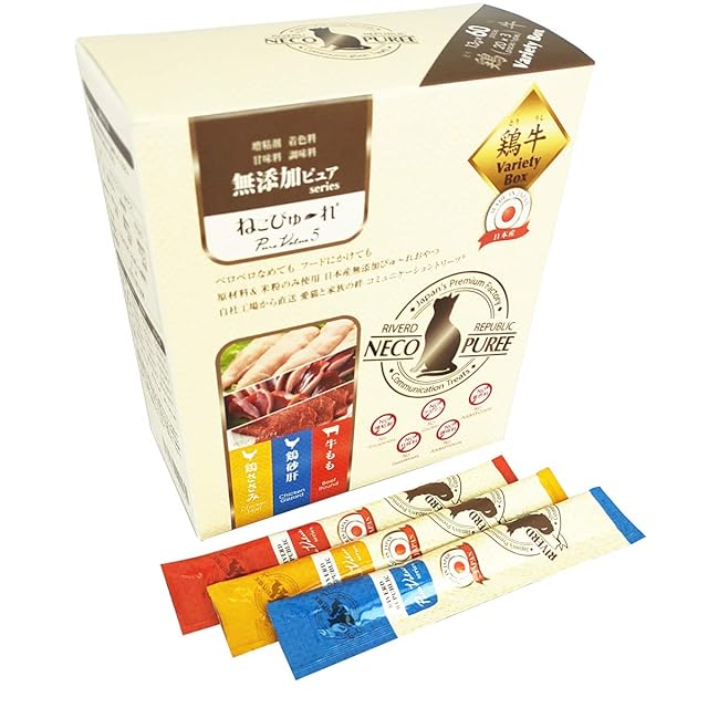 商品名:無添加ピュア 日本産 猫用おやつ ねこぴゅーれ PureValue5 鶏牛 バラエティボックス 60本入 (20本×3種) 鶏ささみ/鶏砂肝/牛もも リバードリパブリック