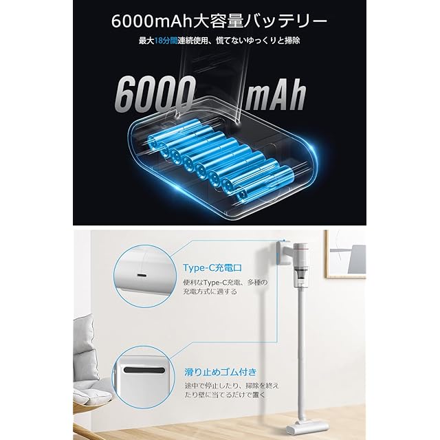【長時間使用可能なバッテリーと静音設計】この掃除機は、6000mAhの大容量バッテリーを搭載しており、最大で35分の連続使用が可能です。一度の充電で家全体の掃除が完了するため、充電時間を気にせず使用できます。さらに、低騒音設計により、早朝や深夜でも周囲に迷惑をかけることなく、静かに掃除が行えます。パワフルながら静かな運転音は、日常の騒音ストレスを軽減し、家族や隣人を気にせず快適に使用できるのが魅力です。多重フィルターシステムが微細なホコリやアレルゲンを確実に捉え、清潔な空気を排出します。