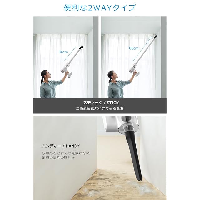 【驚きの軽量設計で快適に使える】このスティッククリーナーは、わずか0.6kgの軽量設計で、片手でも楽に操作できます。その軽さは長時間の使用でも疲れを感じにくく、階段や高い場所の掃除も容易にこなせます。軽量かつコンパクトなので、持ち運びも簡単で、家の中だけでなく車内の清掃にもぴったりです。また、収納スペースを有効活用できるコンパクト設計により、場所を取らずに保管できます。家庭用だけでなく、オフィスでも便利に使えるデザインで、どんな場所でも快適に使えます。これ一台で、家全体を清潔に保ちましょう。