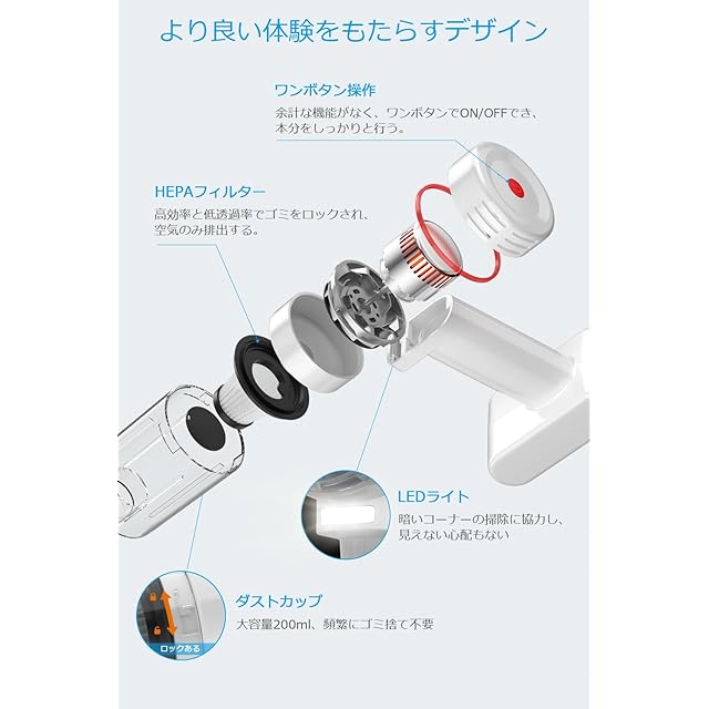 【大容量ダストカップで手間いらず】この掃除機には、透明な200mlの大容量ダストカップが搭載されており、ゴミの量を一目で確認できます。ゴミがいっぱいになる頻度が少ないため、掃除中の手間が省け、効率的に掃除が進められます。ダストカップは取り外しが簡単で、水洗いも可能なので、いつでも清潔な状態を保てます。掃除後もダストカップの中のゴミをすぐに捨てることができるため、手間をかけずに清潔を維持できます。視認性の高いデザインは、ゴミの溜まり具合をリアルタイムで確認でき、掃除の効率をさらに高めます。