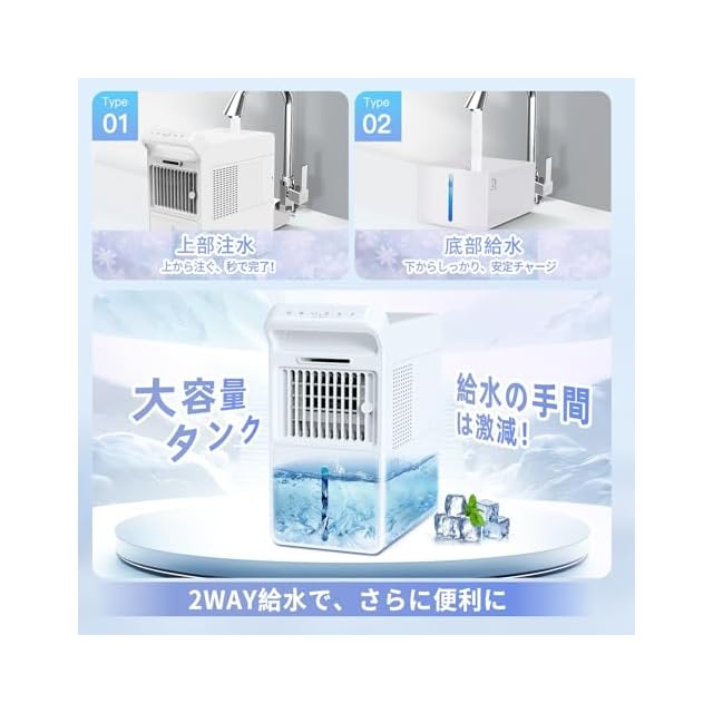 【軽量ボディ×提手付き|給水も持ち運びもストレスゼロ】わずか約1.9kgの軽量設計&持ち手付きボディで、女性や年配の方でも片手でラクに持ち運びOK。リビングから寝室、脱衣所、デスク周りまで、必要な場所に涼しさをそのまま運べる卓上冷風扇です。さらに、上下2WAY給水対応タンクを採用。上からコップでそのまま注ぐのはもちろん、引き出し式タンクをスライドして取り出し給水も可能。給水スタイルを選べるから、シーンに合わせて柔軟に対応できます。水漏れしにくいロック構造+広口設計でお手入れも簡単。機能だけでなく「使いやすさ」にまでこだわった、毎日使いたくなる冷風扇です。