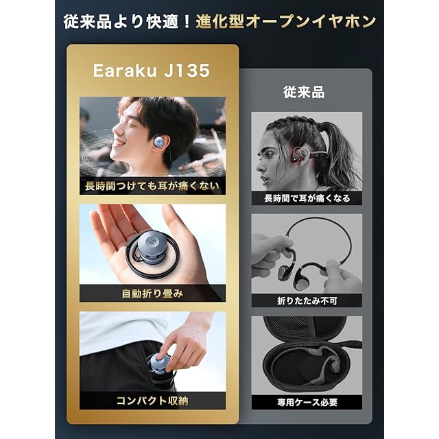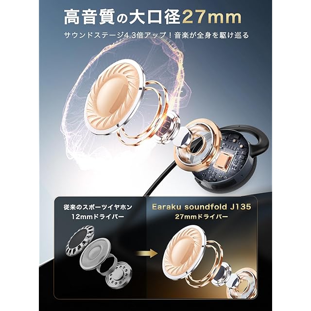 商品名:イヤホン bluetooth【スポーツ専用!2025業界初登場!】Earaku (イアラク) オープンイヤホン ワイヤレスイヤホン ウォーキング 室内運動 ジム ランニング 耳を塞がない パワフルな低音 Bluetooth5.4 23時間再生 耳掛け式 34g超軽量 開放型 イヤーカフ 音漏れ無し 快適な装着感/マルチポイント接続/運動専用 SoundFold J135