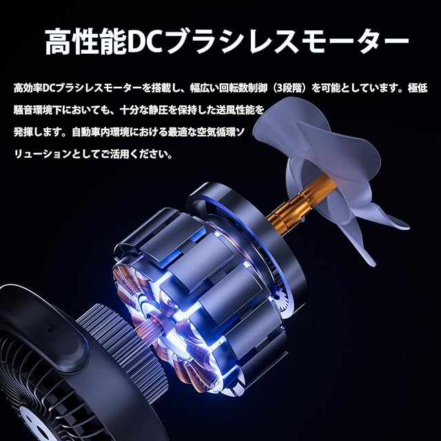 【高性能&静音設計】ドイツ・ボッシュ製の高品質ブラシレスDCモーターを採用したカーファンは毎分9,000回転の高速送風を実現しながら、動作音はわずか35dBと小声で話す並みの低騒音です。ブラシレス設計により摩耗がなく、10万時間の長寿命を。運転中の集中力を持続させるのに最適です。車用ファンはエアコンと併用すれば車内を数分で急速冷却します。