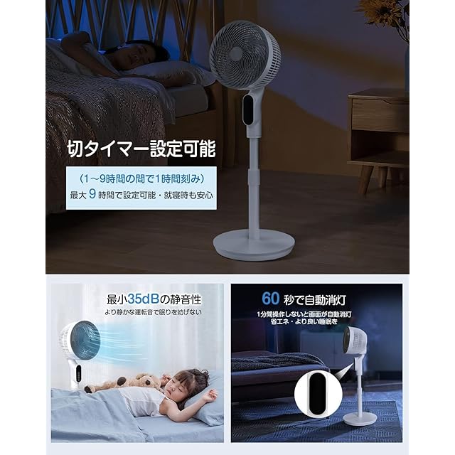 ❉彡【液晶表示無操作60S自動消灯・切タイマー機能・リモコン付き】サーキュレーター扇風機の液晶表示が無操作状態から60秒で自動的に消え、睡眠時に眩しくありませんので、ぐっすり眠れます。明るさ過敏の人にも最適です。設定時間経過後自動的に電源OFFになる切タイマー機能も搭載され、1時間ずつ、最大9時間のタイマーが設定できますので、寝ている時や消し忘れて外出しても安心です。前面のタッチパネルでも指で軽く触れるだけで操作可能ですが、離れた場所からも操作可能なリモコン付き、全ての操作が遠距離操作できるので便利です。