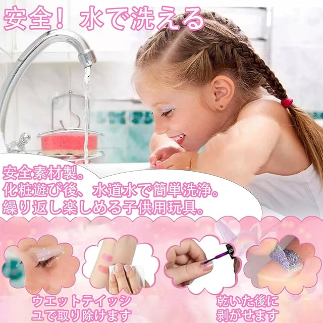 【安全設計&簡単お手入れ】女の子のために特別にデザインされたお化粧玩具です。子供の肌に優しい水溶性配方を採用し、防腐剤無添加で低刺激。肌に負担をかけず、水で簡単に落とせるので、お風呂上がりやお出かけ前のメイク遊びにぴったりです。お母さんも安心して子供に遊ばせられる設計です。