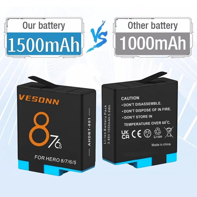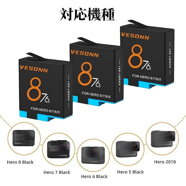Vesonn Hero 8バッテリー 充電器セット 3*1500mAh大容量電池 Hero 5/6/7/8ブラック用 3個セットHero 8予備バッテリー チャージャー 同時充電可能 Type-C USB 収納ボックス式 PSE登録済(For Gopro Hero 8/ Hero 7/Hero 6/ Hero 5) Vesonn Hero 8バッテリー 充電器セット1500mAh互換バッテリー3個 LED付き充電器1個 Hero 5/6/7/8カメラに対応 Type C Micro USB チャージャー 3個同時充電可能 PSE取得済(For Gopro Hero 8/ Hero 7/Hero 6/ Hero 5)