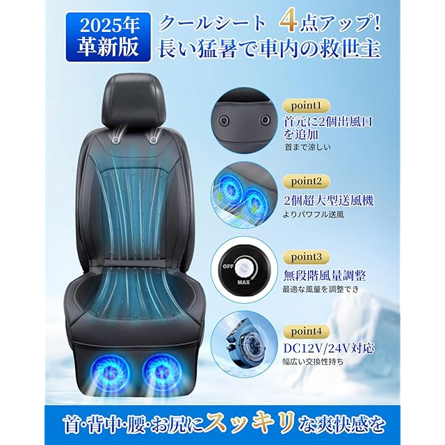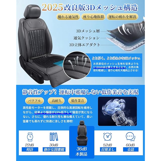 商品名:シートクーラー 車 クールシート 【2025年 2個大型送風機 無段階風量調整 DC12V/24V対応】 首元/背中/座面 42個通気孔 より厚い3Dメッシュ 冷風送風 低作業音 涼しい 蒸れない 通気性 快適ドライブ 滑り止め 取り付け簡単 熱中症対策 長距離運転 (ブラック)