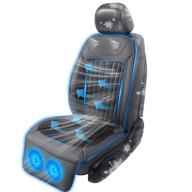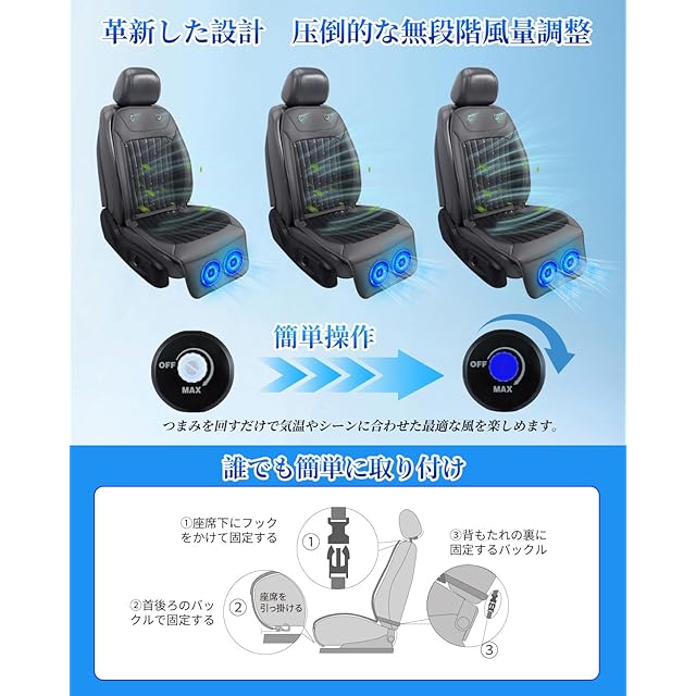 【細部にこだわったクールカーシート】1.シートクーラーの裏面には滑り止めのシリコン製素材を採用しているので、 カーシートクーラーが運転席などから落ちる心配しない。2、高品質レザーを採用し、防汚·撥水·高耐久性を確保しつつ、洗練された仕上げで自動車の内装とも完璧に調和できる。3、人間工学に基づいて曲線デザインでベンチレーションシートをよりフィットにする。4、DC12V/24V車対応でき、軽自動車、SUV、大型トラックなど幅広い車種に対応可能!