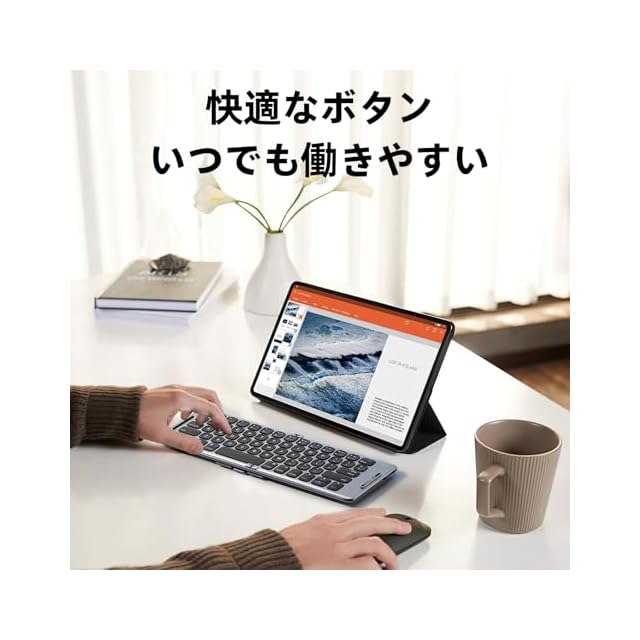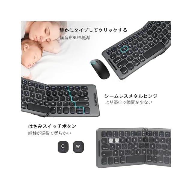 【薄型】ポータブル式Bluetoothキーボード 折りたたみ ・フルサイズ静音キーボードワイヤレス マウスコンボ、Type-C急速充電、iOS、Android、Windows、Macに対応