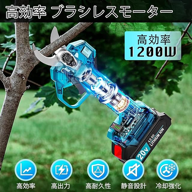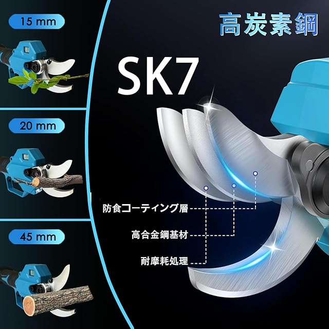 【SK7ブレード切れ味抜群&強力なブラシレスモーター】▼鋏の刃はSK7高炭素テフロン鋼から作られて高硬度で切れ味抜群です。▼ブラシレスモーター搭載してパワーが強くて、45mmまでの生木を1秒に瞬時に切断でき、切れ味が良くて切断面が平にキレイ、植木の健康を守れます。