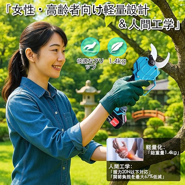 【女性でも操作できますか?】▼この充電式剪定は人間工学に基づき軽くて持ちやすいタイプです、女性や高齢者にも優しい軽量化を実現しており、ソフトグリップが握りやすいため、長時間使用しても腕に負担をかけることなく、時間と体力を節約できます。