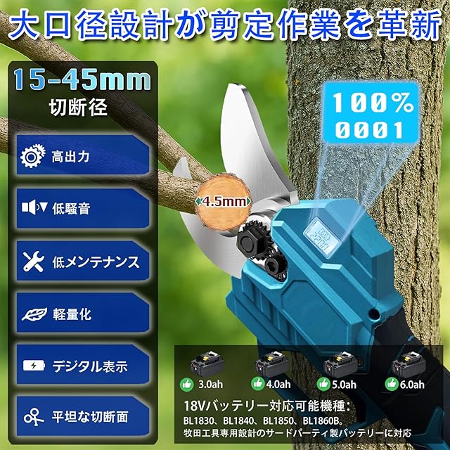 【電動剪定ばさみ45mm切断径 & 3m延長ポールセット】▼45mm電動剪定鋏、さいだい切断径45mmの枝を楽々に切れます。開き口は15mm・20mm・45mmの3段階に調節できる、半開なら小さな開口は作業時間と電力を節約し、全開なら太い枝を簡単に切れます。▼3m延長ポール:作業ニーズの拡張に対応可能 —— 柔軟性・軽量化を両立した設計→ 1段ごとに50cm単位で延長可能(例:1.5m→2m→2.5m→3m)