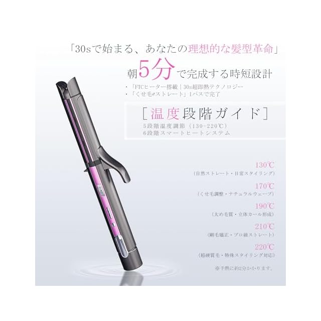 【髪質に合わせた多段階温度調節&安心の自動オフ機能】 FTCヒーティングシステム搭載。通電後わずか20秒でプレートが130℃に到達し、即時造型を可能に。130℃~220℃の6段階温度調節で、細毛は低温保護・太いくせ毛は高温集中処理を実現。45分自動オフ機能搭載で消し忘れ防止と省電力化を両立。過熱防止ヒューズと自動温度制御で、連続使用時も安全安心。