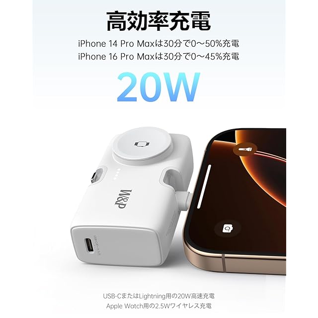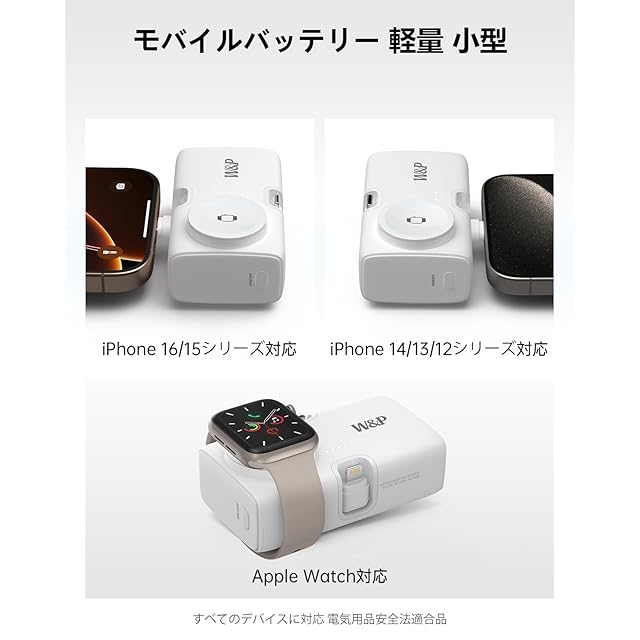 <p>W&P 超大容量バッテリーパック 5000mAh|20W PD急速充電|Apple Watch対応|PSE/QI認証</p> <p><b>【3台同時充電】</b>コード無しのオールインワン設計</p> <p>折りたたみりたたみ型 Lightning/USB-Cポート内蔵(ケーブルなし 瞬間充電不可)</p> <p>iPhone・Android・Apple Watchの3台同時接続可能(友達同士で便利)</p> <p>20W PD急速充電システム(30分で50%充電)</p> <p>Apple Watch専用充電システム(充電器は別途必要)</p> <p><b>【超コンパクト】</b>132gのポケットサイズ</p> <p>サイズ 7.6×4.5×3.3cm (小さめのバッグやジーンズポケットにも収納可能)</p> <p>5000mAhの大容量(iPhone 16を約1回充電可能)</p> <p>通勤、旅行、飛行機旅行に最適(ち込みで機内持ち込み可能)</p> <p><b>【10,000回耐久テスト済み】</b>折りたたみポート</p> <p>独自に強化したヒンジで10,000回戻りリクゲても劣化なし</p> <p>端子保護、損傷防止、長期使用が可能</p> <p><b>【PSE/METI認証済み】</b>7つの安全保護機能</p> <p>過充電/過熱/短絡/過電流/過電圧/過放電/雷保護</p> <p>国際航空法(IATA)準拠(国内線および国際線の安全)</p> <p><b>【2WAY充電】</b>18Wパススルー対応</p> <p>サイド充電または USB-C 直接プラグ充電方式はオプションです。</p> <p>充電中はバッテリーにも同時に電力が供給されます(最大18W入力電力)</p> <p><b>パッケージ内容</b>: W&P 5000mAh モバイルバッテリー x 1。</p>