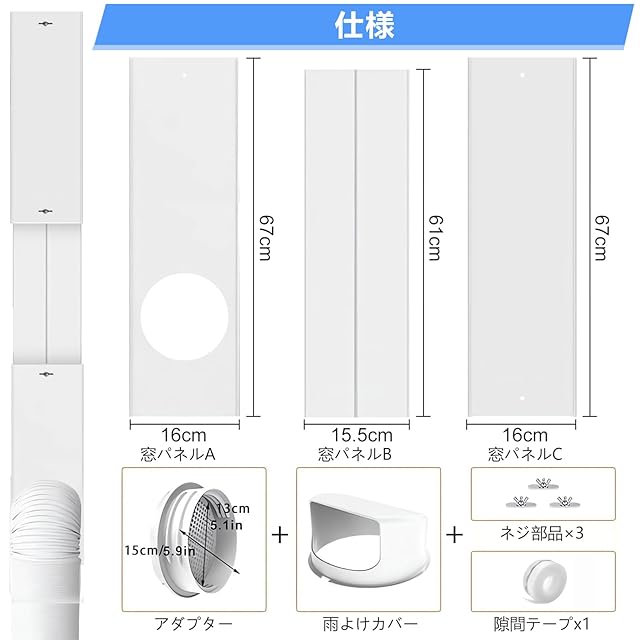 商品説明<BR><BR>ポータブルエアコン用窓用ダクトパネル、調整可能なシールプレート付き。<BR>ポータブルエアコンとダクトパネルを使用することで、室内の熱を外部に放出し、いつでもお部屋を涼しく保つことができて電気代の節約にもお役にたちます。<BR><BR>パッケージ内容:<BR>シールプレート(調整可能長:67cm〜181cm)* 3<BR>ネジ * 4<BR>カップラー * 1<BR>シーリングテープ * 1<BR>注意:ご注文前に、お使いのエアコンが直径13cmまたは15cmの排気ホースに適合するかを必ずご確認ください。<BR><BR>商品特徴:<BR>簡単に取り付けられる窓用ベントキット<BR>ほとんどのポータブルエアコンとの汎用性<BR>冷却効率を向上させるための最大限の空気循環<BR>長持ちする耐久性のある構造<BR>カスタムフィットのための調整可能な長さ<BR>