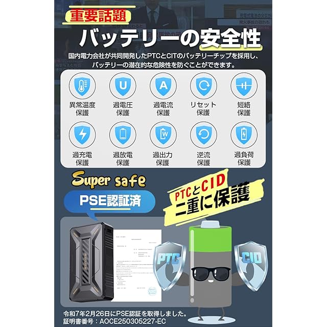 【Super Safe!安心のPSEマーク·40500mAh大容量バッテリー】バッテリーはすでにPSEの認可を得ており、PTCとCITの2重チップを内蔵しており、過熱保護、過電流保護、過負荷保護、短絡保護、過充電保護、自動回復などの特徴があり、他社のように火災のリスクはありません。昨年とは異なり、バッテリーのチップは国内の電力会社が共同開発した最新の成果を採用し、バッテリーの重量が変わらない状況で、バッテリー容量は40500mAhに大幅に向上した。実験室の6カ月間の限界負荷試験によれば、耐久性は信頼できる。「自動モード」の使用時間は約9時間、「42V」風力は約5時間、「38V」風力は約6時間、「34V」風力は約7.5時間、「30V」風力は約10時間、「26V」風力は約13時間、「22V」風力は約21.5時間、「20V」風力は約26時間で、従来の使用時間に比べて大幅にアップしました!専用のアダプターは約5時間で、バッテリーを100%にすることができます。バッテリーの証明書番号:AOCE250305227-EC。アダプターの証明書番号:JD50565692。