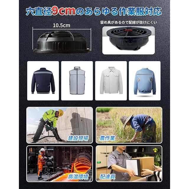 【穴直径9cm対応!3WAY出力!驚異の交換性を実現!】 ファン取り付け部の直径サイズは9cmで、あらゆるの穴直径9cmの空調作業服、空調ウェアー、ファン付きベスト、空調パンツに完璧に対応できる。✅空調ウェア バッテリーはType-C入出力兼用でUSB/DC/Type-C出力対応でき、空調作業服やファン付きベストに限らず、USB/Type-C入力に対応した機種などにも適しています。熱中症対策としてのファンバッテリーセットは現場仕事、配達作業、倉庫内作業、ゴルフ、登山など様々なシーンで大活躍!