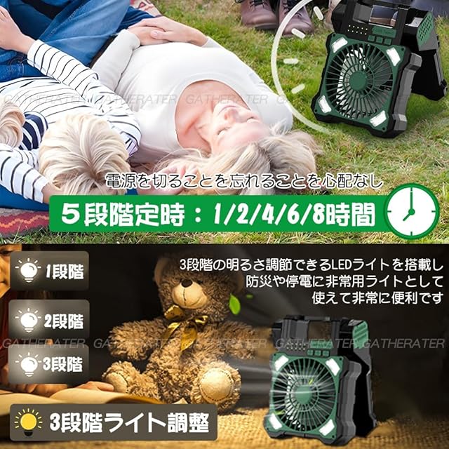 商品名:【2025年 両面ソーラーパネル 効率倍増!】GATHERATER キャンプ扇風機 5200mAh USB充電式 ソーラー充電 5段階風量 5段階タイマー機能 3段階ライト 車中泊 防災 ライト アウトドア携帯キャンプ用品 応急 防災 停電用 日本語説明書付