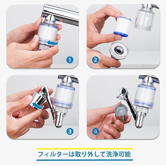 シャワーと泡ストレート2段モードの切り替えとてもスムーズです。 汚れ具合が見えるので使用状況に応じて定期的なカートリッジ交換が必要です 空気を含んだ柔らかい水流の泡沫モードは水はねが少なく、水を節約して、お洗いが楽々です。 直結型浄水器は様々な方向に水が出せるのが便利です。 交換用8個のカートリッジ入りと6種類の変換アダプター付属。 浄水性能あり、水の微小な不純物と汚染物をしっかりろ過できです。