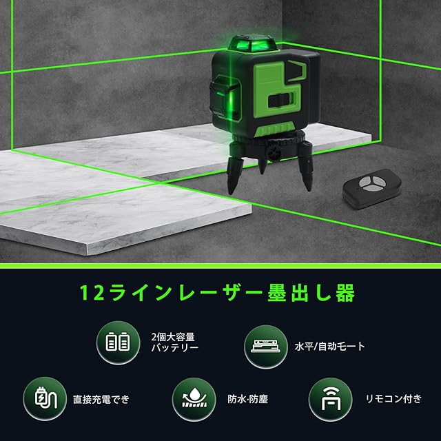 商品名:レーザー墨出し器、墨出しレーザー、3Dグリーンレーザー墨出し器、3x360°、水平器 レーザー ビルドとアライメント用、充電式バッテリー、リモコン、磁気回転スタンド レーザー安全基準:クラス2 12ライン 12LINE