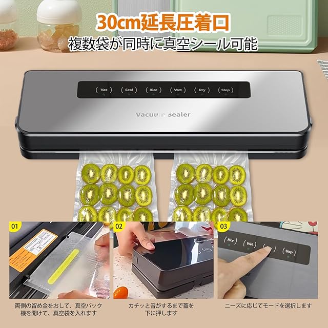 【プロ級真空性能】 80kPaの超大吸引力が空気を徹底排除。雑菌繁殖を1/50以下に抑制し、通常保存より鮮度を持続期間を10倍以上延長。30cmの長いシールラインで隙間なく密封できるため、汁気の多い料理や大型食品も漏れず長期保存可能です。ご注意:手動脱気の場合は少し固さがあり、紋様のある袋をお使いください。なめらかな袋や柔らかすぎる袋では手動脱気機能は使えません。