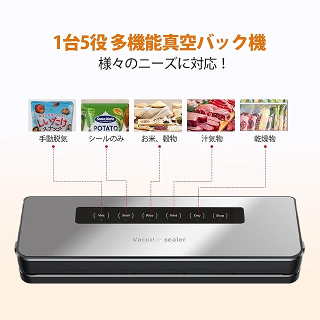 【多機能真空パック機】 乾燥/液体/お米モードに加え、手動調節可能。日本酒の保存や味噌汁の冷凍、おせち料理の下準備まで幅広く対応。30cmの広口設計で寿司飯の一気包装も可能なため、飲食店の業務用としても高い評価を得ています。