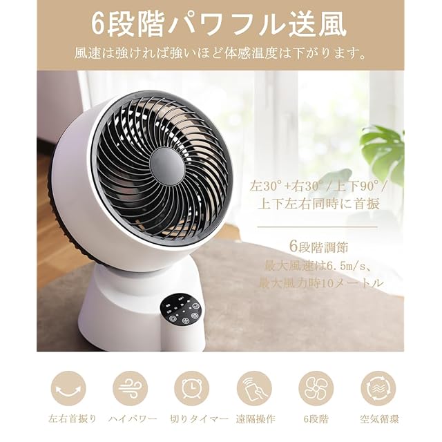 商品名:サーキュレーター DCモーター 静音 強力送風 節電対策 25畳対応 タッチパネル搭載 60S自動消灯 省エネ 上下左右首振り 風量6段階調節 扇風機 0.5-7.5hタイマー機能付き 分解丸洗い 空気循環 換気 衣類乾燥 冷房 暖房器具 部屋干し 梅雨 除湿 兼用