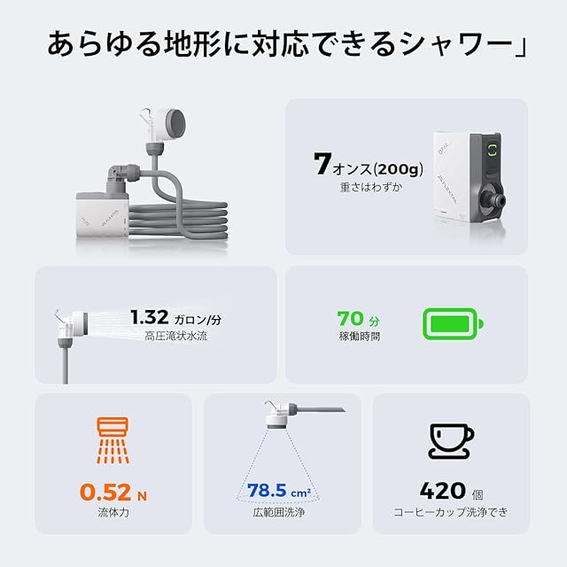 【幅広い用途】:IPX7防水規格に適合し、折りたたみ式フックを備えているため、キャンプ、洗車、ペットの掃除など、アウトドア活動に最適です。旅行、ハイキング、釣りなど、幅広い用途で使用でき、どこにいても信頼性の高いパフォーマンスを発揮します。
