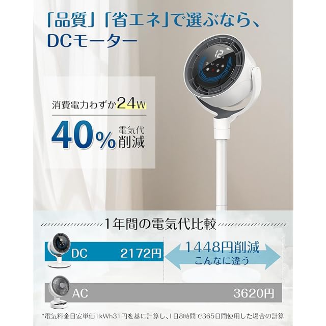 ✅【扇風機 dcモーター&節電対策&驚く静音性】扇風機の電気代を抑えたいなら、DCモーター搭載のサーキュレーター扇風機がおすすめです。本製品の消費電力がわずか24Wで、普通のACモーター扇風機と比べて、約40%電気代を削減でき、財布にも優しい。就寝時につけっぱなしにしても電気代が気にならない程度です。更に、DCモーターが強風ながらも騒音を抑え、扇風機静音20dB未満で(*風量段階1~6において)、図書館よりも静か、集中作業や就寝時を邪魔しません。「省エネ」「長持ち」もDCモーターのメリットです。
