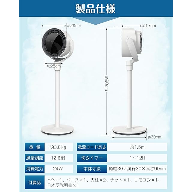 ✅【1年間の安心&パッケージ内容】●サーキュレーター扇風機サイズ:約幅30×奥30×高さ90cm ●重量:約3.8kg ●電源コード長さ:約150cm ●消費電力: 24W ●パッケージ内容:サーキュレーター×1、ベース×1、支柱×2、ナット×1、リモコン×1、日本語取扱説明書×1。お買上げから、最大1年間の付き、万が一、初期不良や自然故障など不具合が応じた場合、「連絡方法」1、取扱説明書で記載している連絡先までご連絡ください。3、「アカウントサービス」>「注文履歴」>「販売元」>「質問する」遠慮なくご連絡ください。