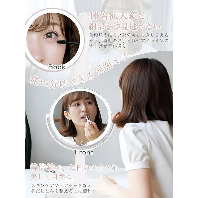 通常鏡と10倍拡大鏡の両面構造で、細部まで丁寧なメイクが可能。白色光・昼白色光・暖色光の3色LEDライトを搭載し、長押しで明るさを無段階調整できます。高さは最大5.5cmまで調整でき、角度も360度回転対応。正方形の台座はスマホスタンドとしても使用可能で、動画を見ながらのメイクにも便利。USB Type-C充電式で2000mAhの大容量バッテリー内蔵。コードレスでスッキリ使え、清潔に保つための専用クロスも付属。誕生日、母の日、クリスマスなどのプレゼントにも最適。安心の30日間返品付き。