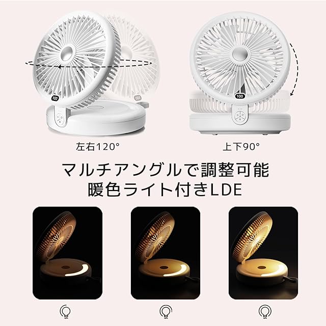 商品名:sumiren サーキュレーター 扇風機 DCモーター 静音 強力送風 5000mA大容量 折りたたみ式 LEDライト機能付き LED3調節可能 卓上扇風機 左右首振り 上下角度調節 Type-C充電式 壁挂可能 一台多役 空気循環 換気 タイマー 衣類乾燥 部屋干し 梅雨除湿 冷房 衣類乾燥寝室 トイレ用 お手入れ簡単 日本語取扱説明書付き