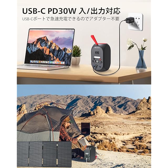 【ACポート付きの本格ポタ電】ミニサイズなのに、ACポート(100V±10%・50Hz/60Hz)付き、定格120Wの出力ができます。1×USB-C PD30Wポート(入出力対応)、1×USB-QC3.0ポート、1×USB-Aポート、1×DC5521ポート、1×ACポートと合計5つの出力ポートあり、多数のデバイスを同時に充電できます。スマホやタブレット、ノートパソコン、ドローン、電気毛布などの日用品を複数回充電しても余裕があります。※警告:SG120のACポートは、定格消費電力120W以上の電化製品を稼働できません!注文前是非ご確認ください。