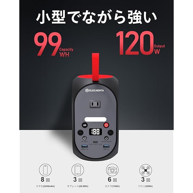 商品名:ELECAENTA ポータブル電源 99Wh 小型 軽量1.5Kg リン酸鉄 AC120W(ピーク200W) PD30W入出力対応 ソーラー充電対応 ぽーたぶる電源 飛行機に持ち込みが可能 家庭用蓄電池 キャンプ 防災 地震 台風 停電 車中泊