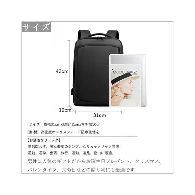 【大容量】リュックサイズは:42*31*10cm、重さ:0.7kg。大容量のビジネスリュックのため、会社のパンフレット、水筒、折畳傘、15.6インチのPC、衣服、雑誌、A4ファイル、財布、スマートフォン、教科書など、さまざまな物品を収納できます。通勤、通学、出張、旅行に欠かせないバッグパックです。