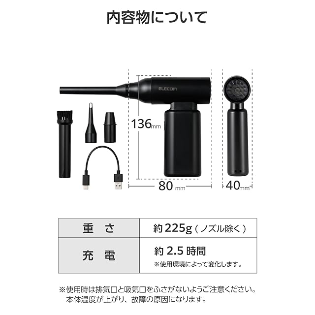 商品名:エレコム 電動エアダスター ブロワー 充電式 強力 小型 軽量 逆さ噴射可能 3段階風量調整 3種類ノズル付き ブラック ADWALBB02BK
