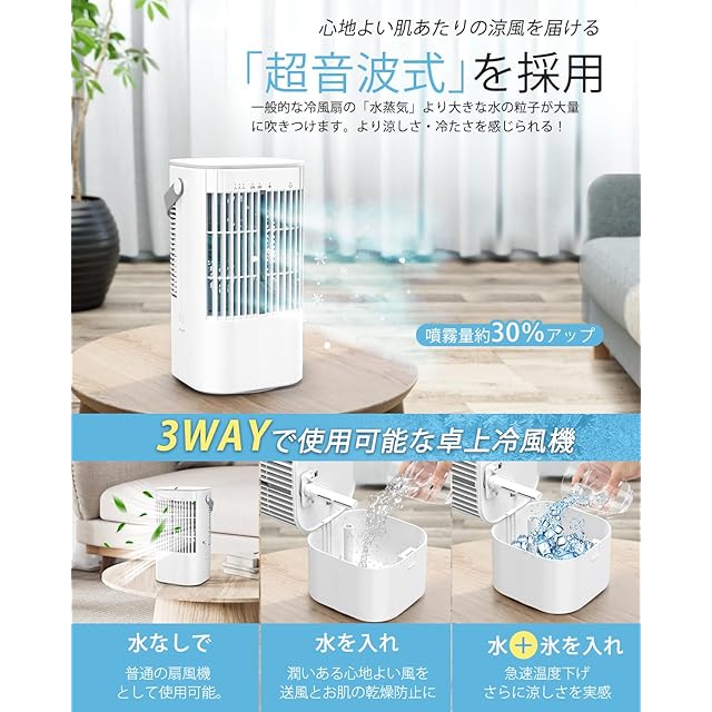 ❉彡【夏は冷風機・冬は加湿器】扇風機として「送風のみ」・部屋の空気に潤いを与える「ミスト加湿」・氷入れ可能な「急速冷却」の3つの機能を兼ね備える2025年夏進化版卓上超音波式冷風扇です。水タンクに水や氷を入れて、素早く爽やかな涼風を発生させ、送風とともに超音波で繊細なミストも噴出され、扇風機より涼しくエアコンほど寒くならない涼風を生み出します。十分な風量を確保しながらエアコンの涼しく快適な体験と加湿器の保湿効果を実現し、クーラーが苦手な方や、乾燥が気になる方にお勧め。梅雨の蒸し暑い時期は「送風のみ」、猛暑日は「送風+ミスト+氷」など、冬には「弱送風+ミスト」にして超音波式加湿器としても使用できるので一年中活躍できます。