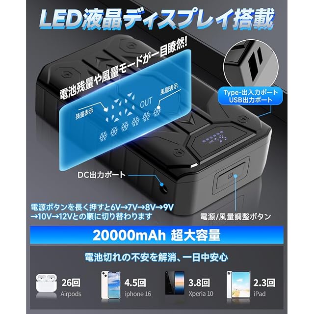 商品名:mAh 空調作業服 バッテリー 20000mAh 大容量 6V-12V高出力 18W最大出力 6段階風力調節 DC/USB/Type-C出力ポート 空調作業服専用モバイルバッテリー LED残量・風量段階表示 空調ベストバッテリー 空調ウェア 専用バッテリー Type-C急速充電 スマホ充電器 携帯充電器 小型 軽量 持ち運び便利 作業着専用 機内持ち込み可能 旅行/出張/緊急用