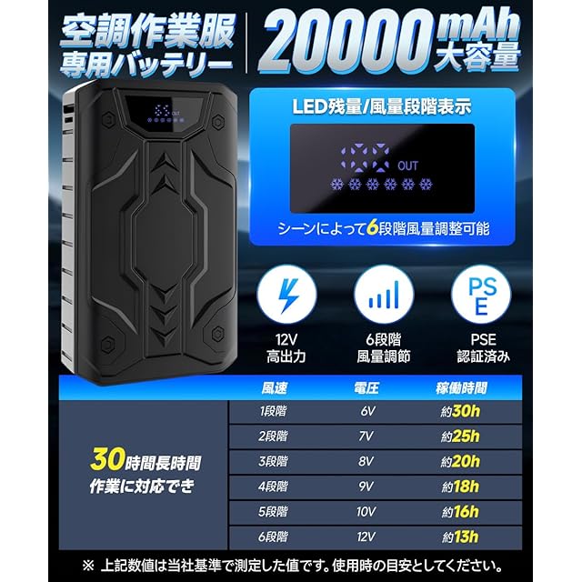 【20000mAh大容量・最大30時間連続稼働】2025夏12V高電圧出力大容量20000mAh空調作業服バッテリーが新登場!12v超高出力空調作業服バッテリーは容量20000mAhに大幅アップしながら、体積が従来より10%減少し、耐久性も大幅に向上しています!フル充電後最大約30時間の連続稼動が可能で、最強風モード(12V)でも約10時間以上の連続稼動可能です。従来の使用時間に比べて大幅にアップしました!長時間仕事をしていても常に涼しい風を感じることができます。真夏でも一日中作業を対応できます。ご注意:mAhの12Vファンと組み合わせて使用することが最大の効果を発揮します。他の12Vファンと組み合わせると風量が低くなる場合があります。