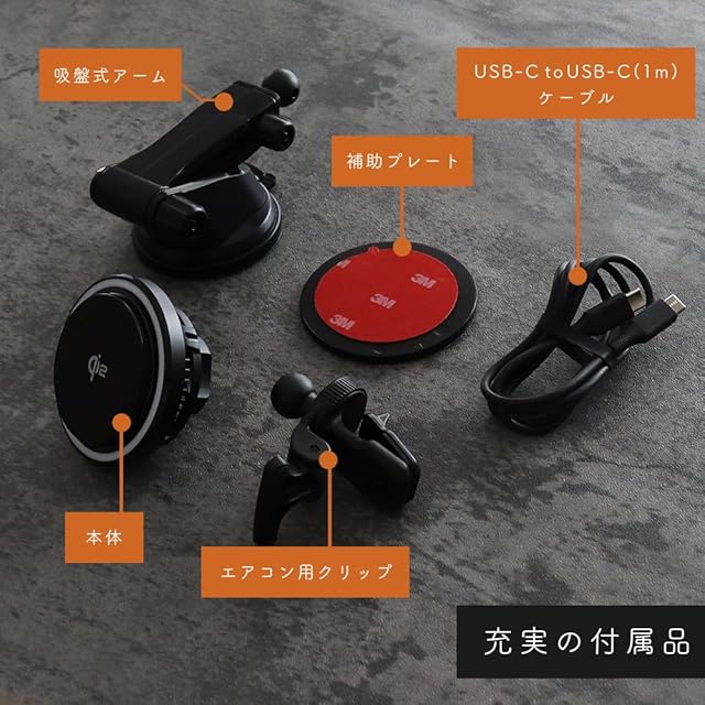 充実の付属品:充電器本体に加え、吸盤式アーム、補助プレート、USB-C to USB-C(1m)ケーブル、エアコン用クリップを付属。 車内のさまざまな取り付け環境に対応できます。