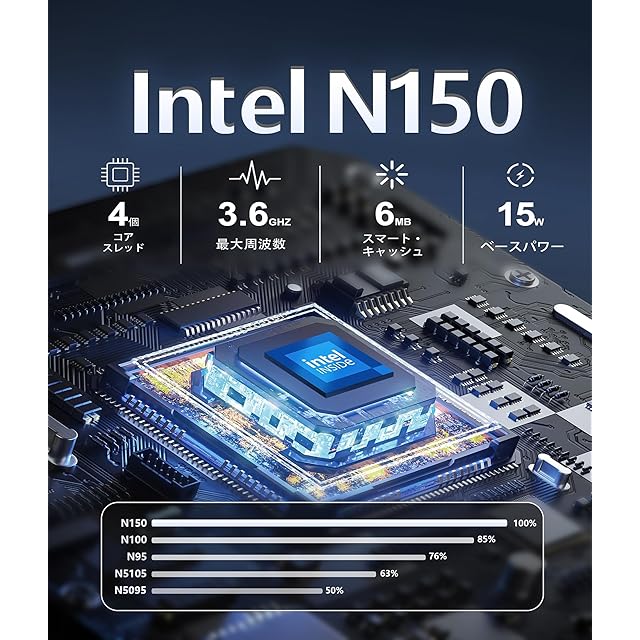 【アップグレードされたCPUパフォーマンスで遅延を回避】FIREBAT N150ミニPCは、Intel第13世代プロセッサーTwin Lake N150(2025年リリース、4コア/4スレッド、6MBスマートキャッシュ、最大3.6GHzターボ速度)と強化されたSuper Finテクノロジーを搭載しています。第12世代(N100、N97、N95)よりも30%以上、第11世代(N5105、N5095、J4125)よりも60%以上も高いパフォーマンス向上を実現します。