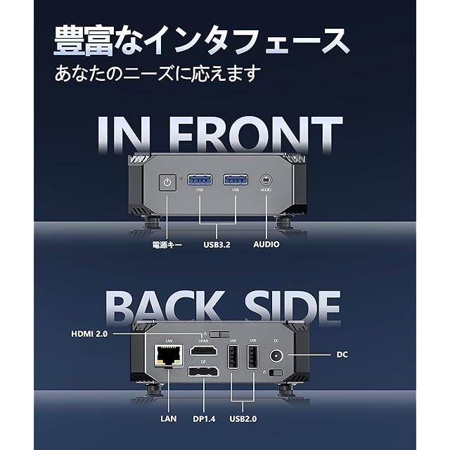 【より多くのインターフェースとより高速な接続】FIREBAT ミニコンピュータは、USB 3.2×2(最大5Gbps / S)、USB 2.0×2、DP1.4×1、HDMI(4K @ 60Hz)×1を搭載し、ギガビットイーサネット、WiFi 5をサポートし、Bluetooth 4.2を内蔵し、さまざまな外部デバイスと簡単にペアリングして、超高速接続、よりスムーズなストリーミング、より高速なダウンロードを実現します。 1000MHzのプロフェッショナルIntelグラフィックスを使用して、デュアル4Kディスプレイを同時に接続し、UHDビデオ出力と柔軟なマルチタスクを提供できます。